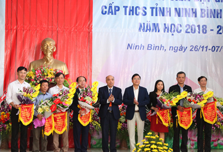 Lãnh đạo Sở Giáo dục và Đào tạo tặng cờ và hoa cho các đơn vị tham gia hội thi. Ảnh: Minh Quang
