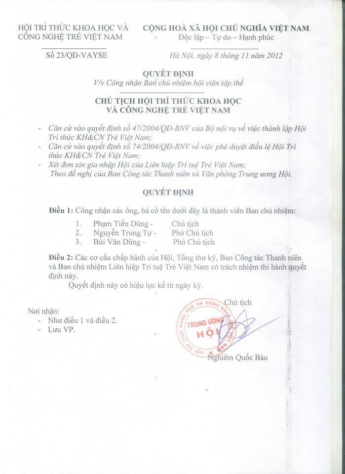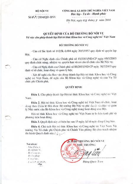 Bộ trưởng Bộ Nội vụ về việc phê duyệt điều lệ Hội Trí thức Khoa học và Công nghệ trẻ Việt Nam. Năm 2012, Chủ tịch Trung ương Hội Trí thức Khoa học và Công nghệ trẻ Việt Nam ký